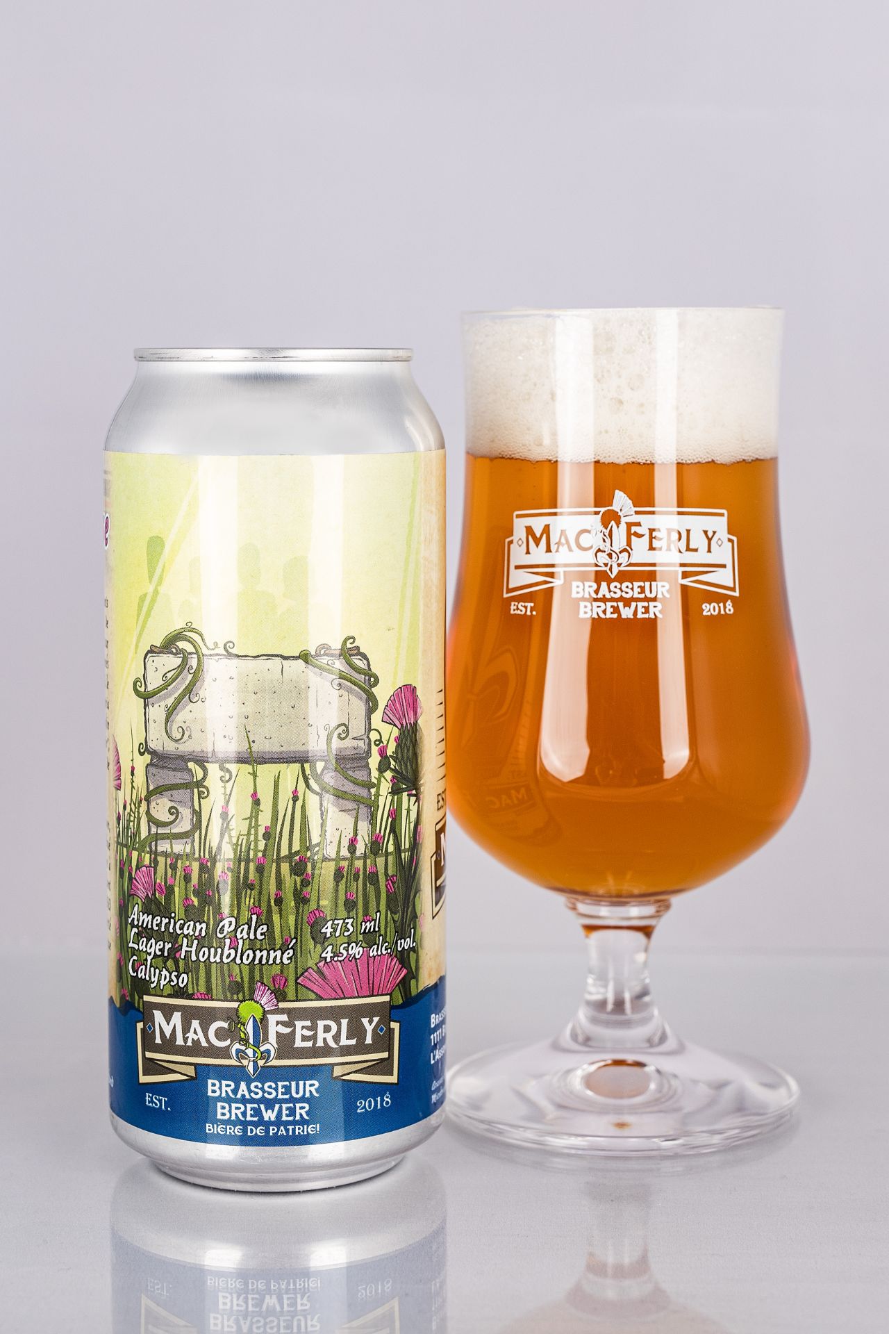 American Pale Lager. Notre ‘’American Pale Lager’’ vous est présentée dans une version plus houblonnée qu’à l’habitude afin de vous offrir une expérience des plus désaltérante! Elle se veut une bière mono-houblon avec un houblonnage de Calypso à l’ébullition et en ‘’Dry-Hop’’. Cet houblonnage vous apportera des arômes au nez de poires et de pommes vertes avec une légère touche de thé vert! En bouche, vous retrouverez tout le côté croquant et biscuité usuel d’une bonne Lager. Avec son 4.5% d’alcool, elle se veut une bière des plus légère, désaltérante et fraîche! Fraicheur est définitivement le mot qui la définit dans son ensemble!